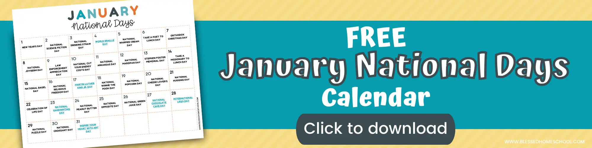 I’ve also created a free printable January National Day calendar you can download and display in your homeschool. I’d recommend picking out a few days in advance you want to study or celebrate, and then work the writing prompts into your lesson plans for that specific day.